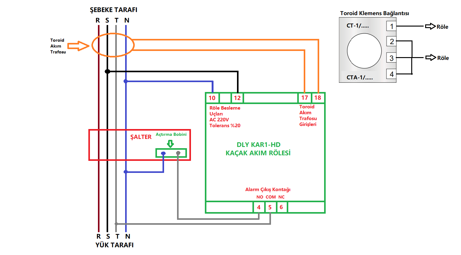 - Toroid akım trafosu kablosu bağlantısı kopması durumunda veya toroid akım trafosu arıza durumlarını bildirme özelliğine sahiptir.