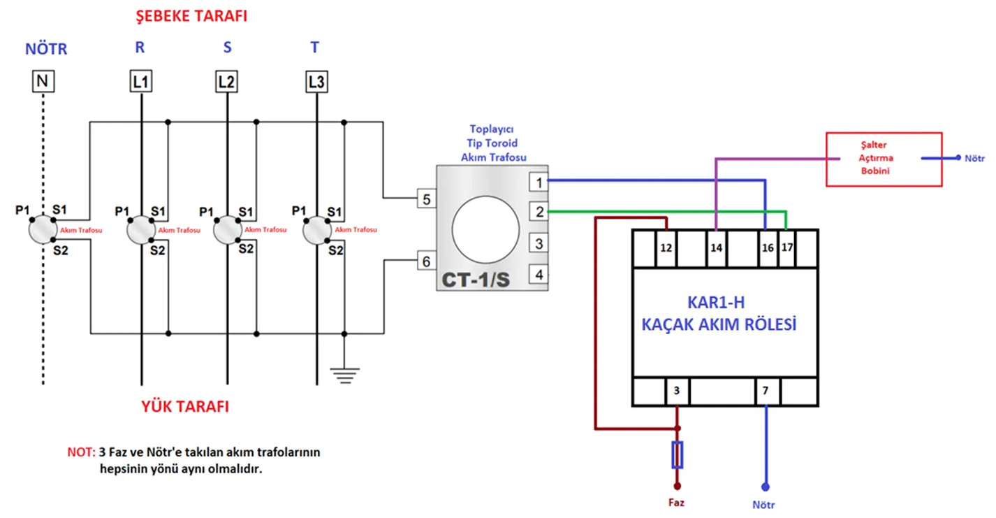 Nötr’süz Sistem KAR1-H Kaçak Akım Rölesi İle Toplayıcı Tip Toroid Akım Trafosu Bağlantı Şekli: